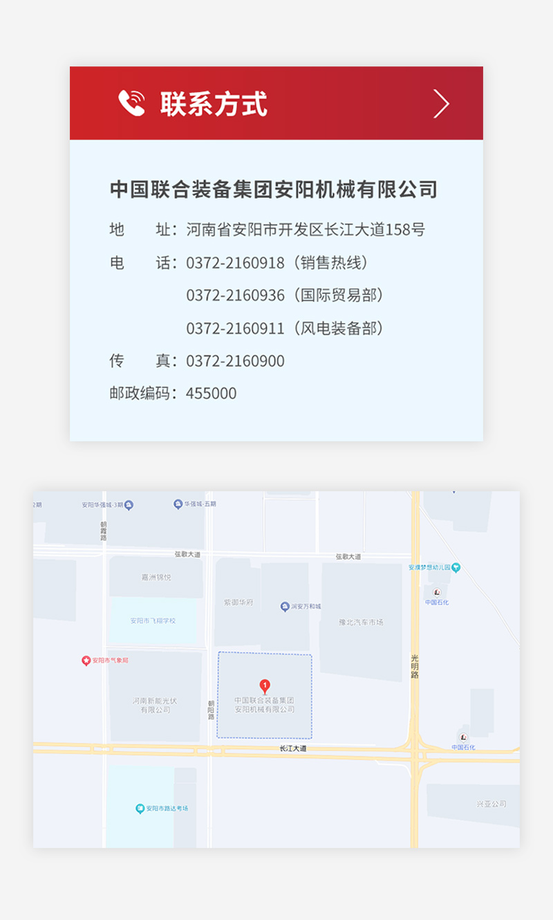 公司地址: 河南省安陽市開發(fā)區(qū)長江大道158號 電話: 0372-2160918(銷售熱線) 電話: 0372-2160936(國際貿(mào)易部) 電話: 0372-2160911(風(fēng)電裝備部) 傳真: 0372-2160900 備案號: 豫ICP備2022005559號-2