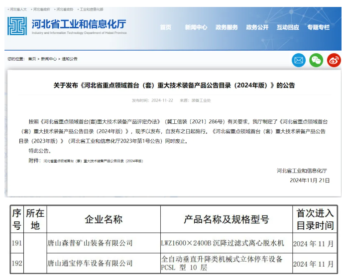 11月21日,河北省工業(yè)和信息化廳發(fā)布了《河北省重點領域首臺(套)重大技術裝備產品公告目錄(2024 年版)》,唐山森普“LWZ1600×2400B 沉降過濾式離心脫水機”和唐山通寶“全自動垂直升降類機械式立體停車設備PCSL 型10層”成功入選。
