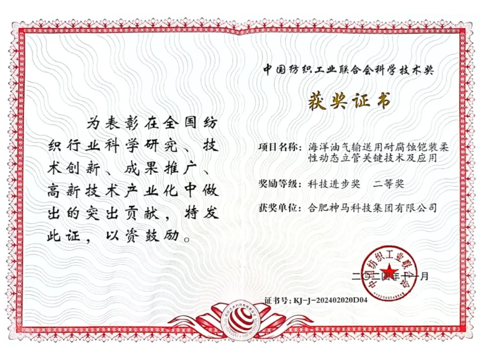 合肥神馬參與研究的“海洋油氣輸送用耐腐蝕鎧裝柔性動態(tài)立管關鍵技術及應用”項目榮獲中國紡織工業(yè)聯合會科學技術獎的科技進步獎二等獎。在此項目中,公司與管道制造企業(yè)密切合作,成功研發(fā)了海洋柔性動態(tài)立管成套裝備。這一突破性成果為中國海洋資源的開發(fā)與利用提供了堅實的裝備保障,進一步推動了中國海洋工程領域的高質量發(fā)展。