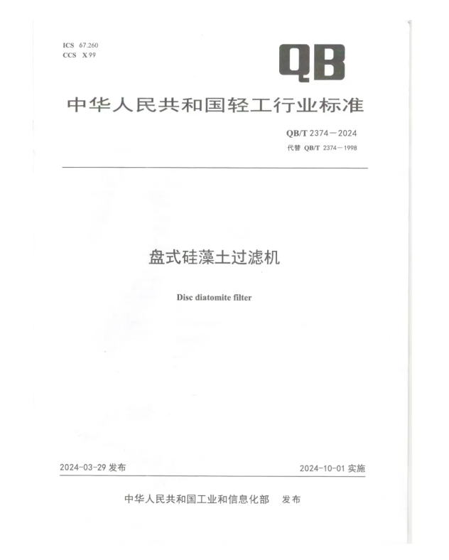 重慶中輕參與修訂的行業(yè)標準《盤式硅藻土過濾機》(QB/T 2374-2024)正式發(fā)布實施。此標準是在1998版本基礎上進行修訂,將在提升盤式硅藻土過濾機主要性能指標、推進設備的安全穩(wěn)定使用和促進上下游產業(yè)升級等方面發(fā)揮保障作用,對推動食品安全、促進行業(yè)健康發(fā)展具有重大意義。